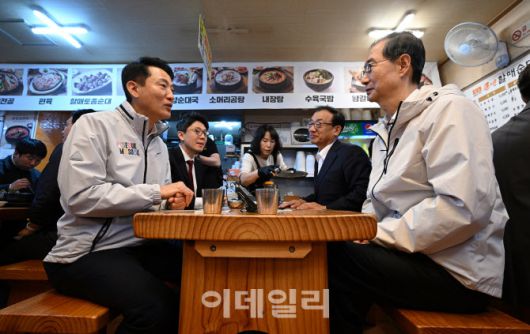 [이데일리 김태형 기자] 제21대 대통령 선거에 출마한 한덕수 전 총리가 2일 서울 종로구 주민공동시설 '새뜰집'을 방문해 오세훈 서울시장과 의 오찬간담회를 갖고 있다.