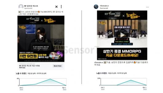 출시 전후 진행된 넷마블의 적극적인 마케팅 또한 ‘RF 온라인 넥스트’의 흥행에 크게 기여했다. RF 온라인 IP 기반 웹툰, 웹소설 ‘배드 본 블러드’를 선보여 IP를 확장하고, 유튜브와 메타 플랫폼을 중심으로 한 디지털 광고 캠페인을 집중적으로 펼쳤다. 센서타워 패스매틱스에 따르면, 넷마블은 3월 한국 시장 페이스북과 인스타그램 합산 광고 노출 수에서 2월 대비 8배 이상 증가하며 게임 광고주 중 노출 수 2위를 기록했다. 특히 ‘노빠꾸 탁재훈’과의 협업을 중심으로 한 동영상 광고 소재가 높은 노출 수를 기록했다.