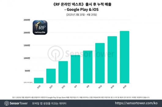 앱 분석 전문 업체 센서타워의 앱 퍼포먼스 인사이트에 따르면, 넷마블이 지난 3월 20일 출시한 모바일 MMORPG ‘RF 온라인 넥스트’가 출시 이후 첫 달 동안 누적 다운로드 약 30만 건을 기록하고, 2,000만 달러 이상의 매출을 달성한 것으로 나타났다(구글 플레이 스토어와 애플 앱스토어 통합 추정치 기준).