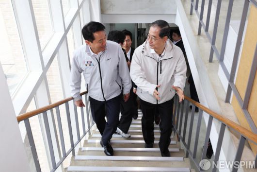 [서울=뉴스핌] 양윤모 기자 = 제21대 대선 출마를 선언한 한덕수 전 국무총리가 2일 오후 오세훈 서울시장과 함께 서울 종로구의 쪽방촌을 방문해 쪽방상담소 시설을 둘러보며 대선 행보를 시작했다.  [공동취재] 2025.05.02 yym58@newspim.com
