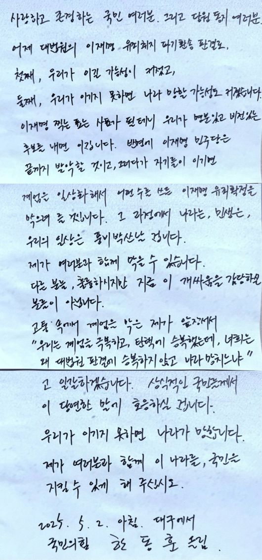 한 후보는 2일 자신의 페이스북에 “지난밤 대구에서 잠을 이루지 못했다”며 “국민 여러분께 흙탕물 튀지 않게, 제가 저 민주당 진흙탕에 뛰어들어 싸워 이기겠다”고 말하며 손으로 쓴 편지를 올렸다.
