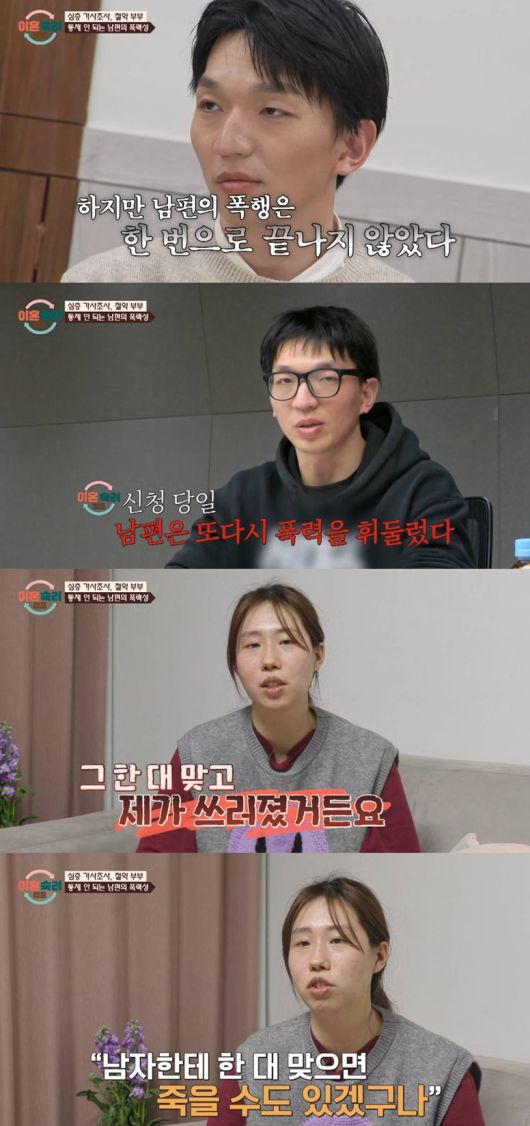 통제되지 않는 남편의 폭력성 진술이 그대로 방송에 나왔고, 아내는 "한 대 맞고 쓰러졌는데, 죽을 수도 있겠구나 싶어서 그만 때리라고 했다"는 증언을 했으며 남편은 "아내가 토할 정도로 때렸다. 얼굴 위주로 많이 때렸다. 멈춰야겠다는 생각은 드는데 통제가 안됐다"고 이를 인정했다.