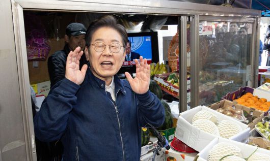 이재명 더불어민주당 대통령 후보가 ‘골목골목 경청투어’ 접경지역 방문 이틀째인 2일 강원 철원군 동송 전통시장에서 시민들에게 인사하고 있다. 공동취재 사진 |