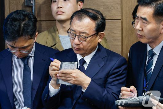 (서울=뉴스1) 안은나 기자 = 한덕수 캠프에 합류한 이정현 전 새누리당 대표가 2일 서울 여의도 국회 소통관에서 대선 출마 선언을 마친 한 전 총리의 답변을 메모하고 있다. 2025.5.2/뉴스1coinlocker@news1.krCopyright ⓒ 뉴스1. All rights reserved. 무단 전재 및 재배포, AI학습 이용 금지.