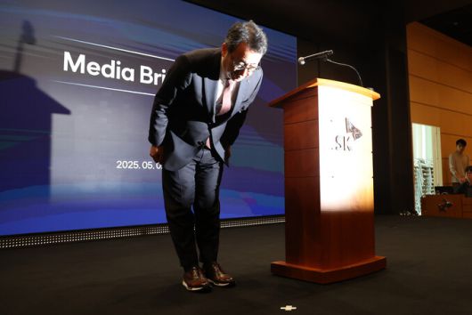 유영상 에스케이(SK)텔레콤 대표이사가 2일 서울 중구 에스케이티타워에서 열린 유심 정보 유출 사고 관련 브리핑에서 고개 숙여 인사하고 있다. 연합뉴스 |