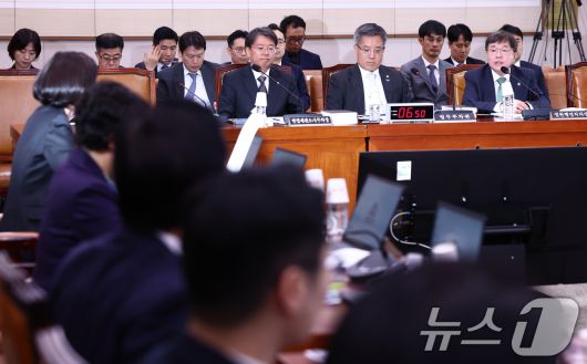 배형원 법원행정처 차장(오른쪽)이 2일 오전 서울 여의도 국회에서 열린 법제사법위원회 전체회의에서 의원 질의에 답변하고 있다. 오른쪽부터 배 차장, 김석우 법무부 차관, 김정원 헌법재판소사무처장. 2025.5.2/뉴스1 ⓒ News1 김민지 기자 |