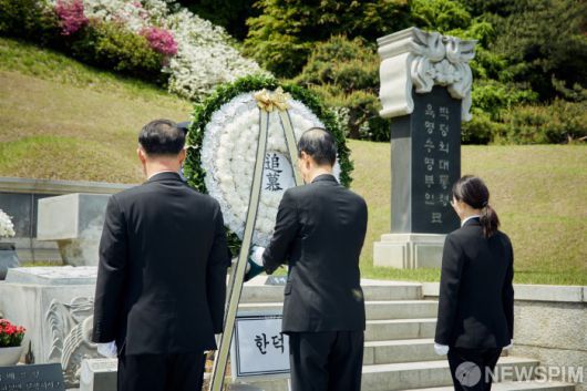 [서울=뉴스핌] 대선 출마를 선언한 한덕수 전 국무총리가 2일 서울 동작구 국립서울현충원 박정희 전 대통령 묘역을 찾아 참배를 하고 있다. [사진=한덕수 캠프] 2025.05.02 photo@newspim.com