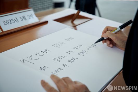 [서울=뉴스핌] 대선 출마를 선언한 한덕수 전 국무총리가 2일 서울 동작구 국립서울현충원 현충탑을 찾아 참배를 마치고 방명록을 작성하고 있다. [사진=한덕수 캠프] 2025.05.02 photo@newspim.com |