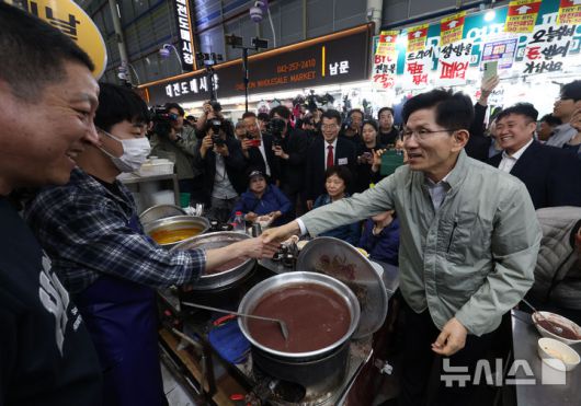 [대전=뉴시스] 고승민 기자 = 김문수 국민의힘 대선 경선 후보가 1일 대전중앙시장을 방문, 상인들과 인사를 하고 있다. 2025.05.01. kkssmm99@newsis.com |