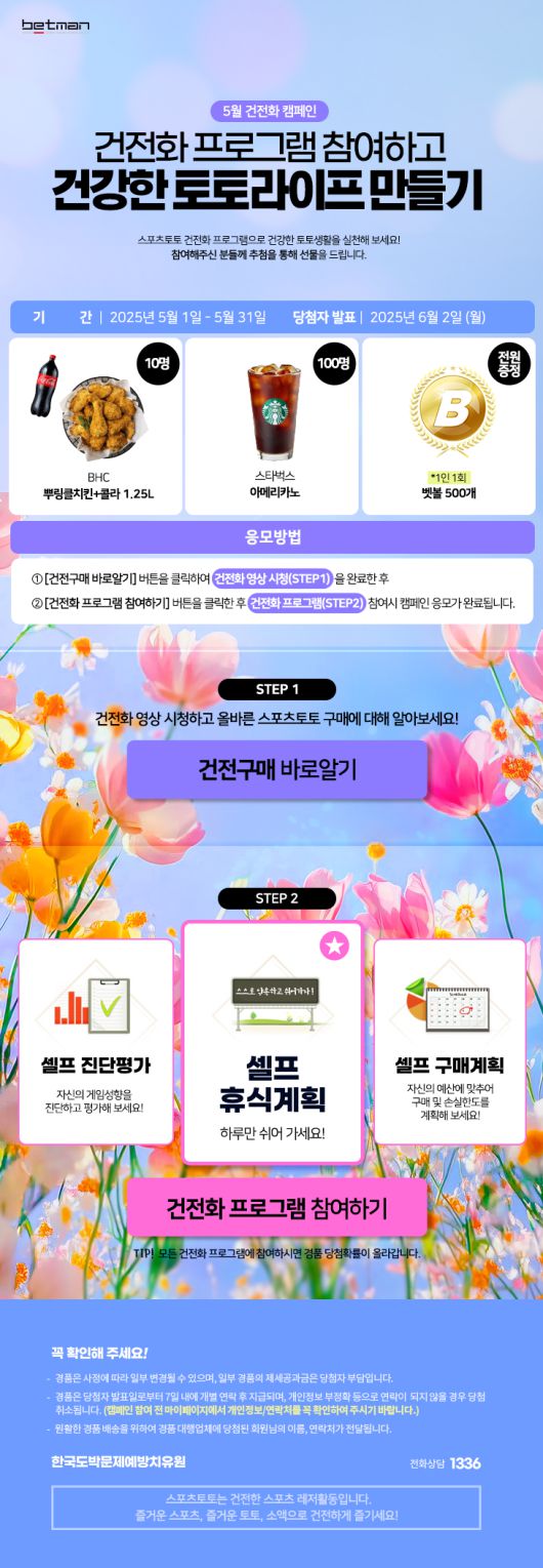 국민체육진흥공단이 발행하는 체육진흥투표권 스포츠토토의 공식 인터넷 발매사이트 베트맨이 2025년 5월 건전화 캠페인인 ‘건전화 프로그램 참여하고 건강한 토토라이프 만들기’ 이벤트를 오는 31일까지 진행한다고 밝혔다.