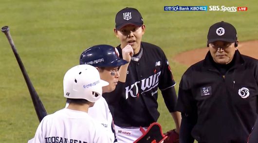 소형준은 양의지에게 사과했고 양의지는 미소를 지으며 1루로 걸어나갔다.