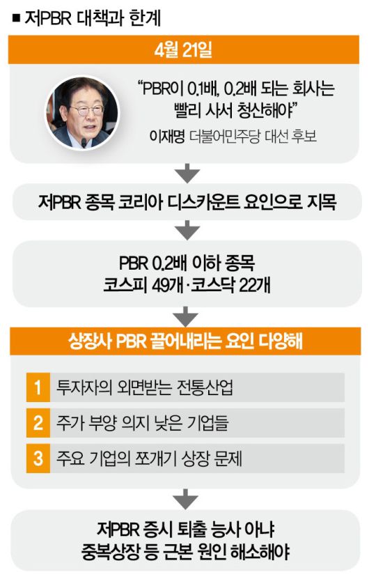 저PBR(주가순자산비율) 기업이 코리아 디스카운트의 요인으로 지목됐다. 이재명 더불어민주당 대선후보가 "PBR 0.2배 미만인 기업을 국내 증시에서 퇴출해야 한다"며 논의의 장을 열어젖혔다. 하지만 저PBR 기업을 기계적으로 솎아내는 게 옳은지는 따져봐야 한다. 중복상장 등 저PBR의 근본 원인을 그대로 둔 채 퇴출을 밀어붙여선 안 된다는 목소리도 나온다.