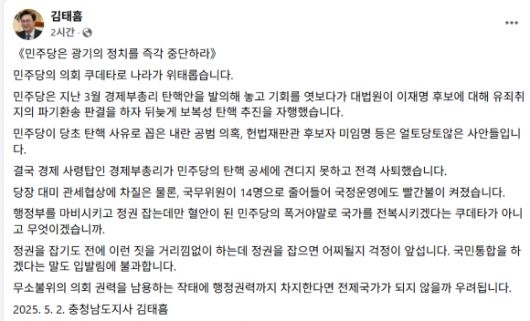 김태흠 충남지사는 더불어민주당이 1일 최상목 부총리 겸 기획재정부 장관 탄핵소추안을 국회 본회의에 상정한 것과 관련 2일 “민주당은 광기의 정치를 즉각 중단하라”고 비판했다.