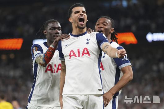 [런던=AP/뉴시스] 잉글랜드 프로축구 프리미어리그(EPL) 토트넘 홋스퍼의 도미닉 솔란케(가운데. 2025. 5. 1. |