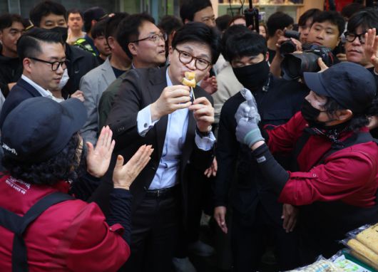 한동훈 국민의힘 대선 경선 후보가 2일 오후 부산 중구 부평동 부평깡통시장을 찾아 어묵을 맛보고 있다. /연합 |