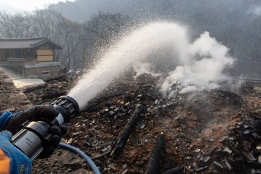 전국 곳곳에 산불이 이어지고 있는 지난 3월 27일 경북 의성군 고운사에서 소방대원들이 잔불을 정리하고 있다. 이번 산불로 국가지정 문화유산 보물로 지정된 고운사 가운루와 연수전 등이 전소됐다. 뉴스1 |