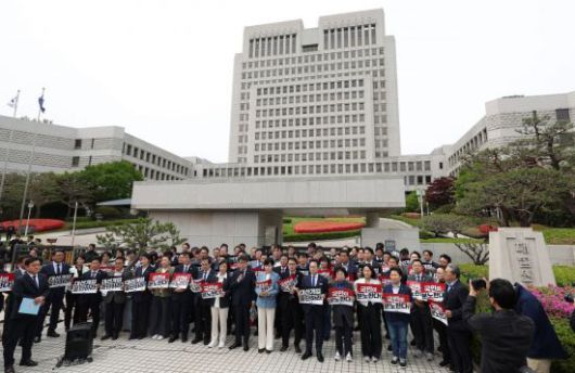 민주당 소속 의원 60여 명은 이날 대법원 앞에서 '국민이 분노한다', '대선 개입 중단하라' 등의 피켓을 든 채 전날 판결을 규탄하는 기자회견을 열었다.