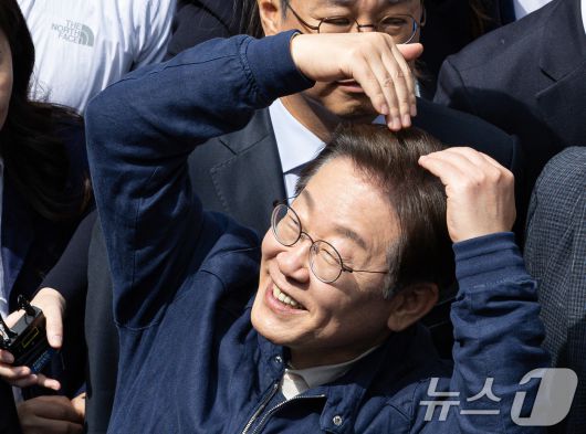 이재명 더불어민주당 대통령 후보가 1일 오후 경기도 연천군 전곡시외터미널 인근에서 시민들과 기념촬영을 하고 있다. 2025.5.1/뉴스1 ⓒ News1 이재명 기자 |