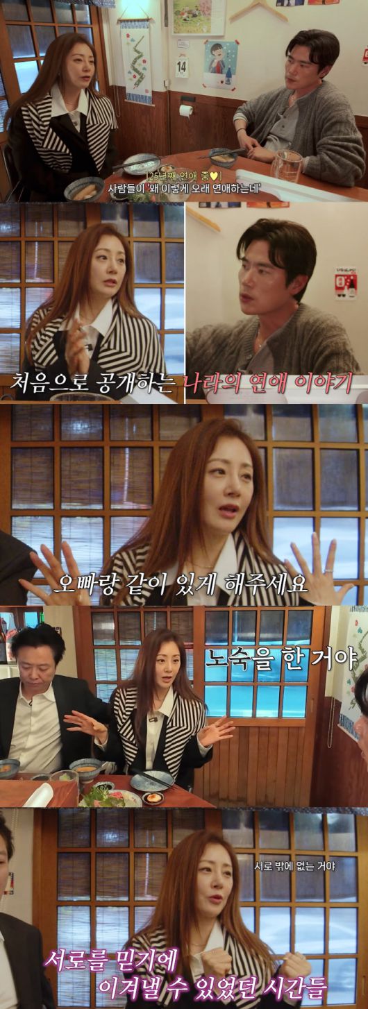 25년째 연애 중인 오나라는 "사람들이 '오래 연애하는데 어떻게 안 헤어지고 이렇게 오래 만나냐'고 물어보는데 사실은 그럴 수밖에 없는 이유가 있다"며 입을 열었다.