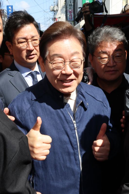 이재명 더불어민주당 대선 후보가 '골목골목 경청투어' 접경지역 방문 이틀째인 2일 강원도 철원군 동송전통시장에서 상인들과 만나 인사하고 있다. /연합 |