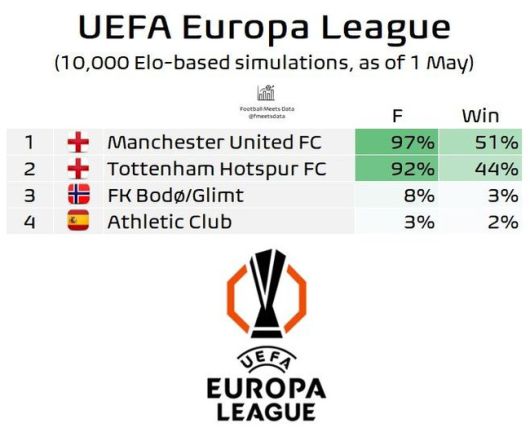 우승 확률은 어떻게 될까. 매체는 맨유의 우승 확률이 51%라고 보았다. 토트넘의 우승 확률은 44%였다. 보되/글림트(3%), 빌바오(2%)는 한 자리 확률이었다. 즉 요약하자면 토트넘과 맨유가 결승에서 맞부터 맨유의 우승 확률이 근소하게 높다는 이야기였다.