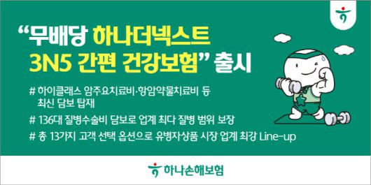 이번에 출시한 하나손해보험의 ‘하나더넥스트 3N5간편 건강보험’ 또한 질병 및 상해로 인한 입원 수술 이력에 따라 맞춤형 요율이 적용되는 상품이다. ‘하이클래스 암주요 치료비, 항암 약물 치료비’ 등 최신 담보를 탑재해 고액이 소요되는 전액본인부담 암 치료비를 보장한다.