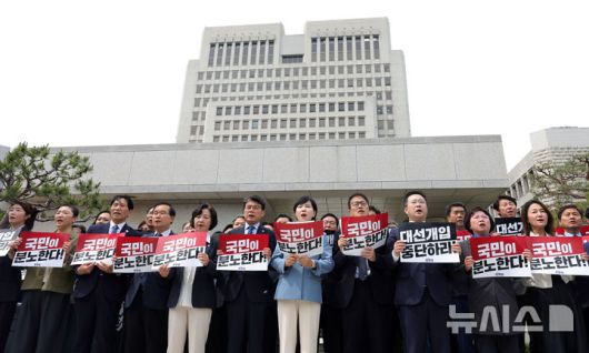[서울=뉴시스] 홍효식 기자 = 더불어민주당 의원들이 2일 오후 서울 서초구 대법원 앞에서 이재명 대선 후보의 공직선거법 위반 사건을 유죄 취지로 파기환송 판결한 것과 관련해 대법원 규탄 기자회견을 하고 있다. 2025.05.02. yesphoto@newsis.com |