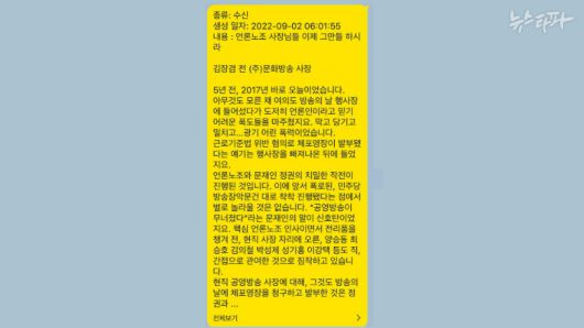 2022년 9월 2일 오전 6시 1분, 김장겸은 방송의날을 맞이해 자신이 작성한 ‘언론노조 사장님들 이제 그만들 하시라’는 글을 명태균에게 공유했다. 자신을 문재인 정권 탄압의 희생양으로 묘사하며 한상혁 방송통신위원장과 KBS, MBC 등 공영방송 사장들이 물러나라고 촉구하는 내용이다.