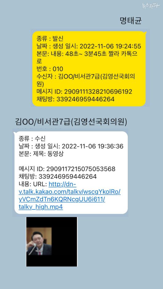 2022년 11월 6일에도 김장겸은 “죽이네요!” 라고 감탄하며 ‘재명아, 개수작 부리지 마’라는 제목의 유튜브 영상을 명태균에게 공유했다. 명태균은 이를 다시 김영선 의원실 비서관에게 그대로 전달하며 “48초~3분45초 짤라 카톡으로”라고 지시한다. 비서관이 편집한 영상을 보내오자, 명태균은 이를 다시 지인들에게 카톡으로 보냈다.