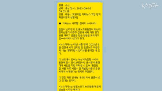 가짜뉴스·괴담 방지 특별위원회 위원장이 된 김장겸은 명태균에게 '신학림 전 언론노조위원장이 김만배와 허위 인터뷰를 하고 금품을 받았다'는 성명서를 보냈다. 이에 명 씨는 ‘파이팅’ 이모티콘으로 화답했다. 이날 대화가 두 사람의 마지막 카톡이다.