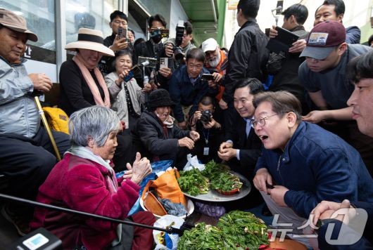 (인제=뉴스1) 이재명 기자 = '골목골목 경청투어 : 접경벨트편'에 나선 이재명 더불어민주당 대통령 후보가 2일 오후 강원 인제군 북면 원통시장에서 한 상인과 대화를 하고 있다. 2025.5.2/뉴스12expulsion@news1.krCopyright ⓒ 뉴스1. All rights reserved. 무단 전재 및 재배포, AI학습 이용 금지.