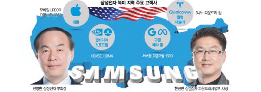삼성전자(005930) 반도체를 총괄하는 전영현 디바이스솔루션(DS)부문장(부회장)을 비롯한 수뇌부가 연휴를 반납한 채 미국 실리콘밸리에서 애플과 엔비디아 등 빅테크를 차례로 만난다. D램부터 차세대 고대역폭메모리(HBM), 파운드리(반도체 위탁 생산) 등 반도체 전 분야 걸친 수주 기반을 다지는 한편 미국의 관세정책에 대한 대응 방안을 논의할 것으로 전망된다.