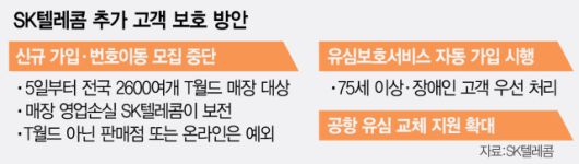 SK텔레콤은 직영점·대리점을 포함한 모든 T월드 매장에서 신규 고객 상담을 중단하고 유심 교체 업무에 집중하기로 했다. 모집 중단 기간에 발생한 매장 영업 손실에 대해서는 보전할 방침이다. 하루 유심 교체 가능 대상은 20만~25만 명으로 추산되며 15일 이후부터는 유심 부족 사태가 해결될 것으로 전망된다. 다만 SK텔레콤과 직접 위탁계약을 맺지 않은 전국 수만 곳의 휴대폰 판매점이나 온라인 유통 채널의 가입자 유치는 계속 유지된다. 유 대표는 “SK텔레콤과 직접 계약을 맺지 않는 판매점은 대리점보다 더 소상공인이기에 영업을 중단하라고 말하는 것은 굉장히 어려운 일”이라고 설명했다.