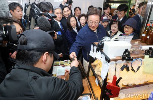 [인제=뉴스핌] 최지환 기자 = 이재명 더불어민주당 대선 후보가 '골목골목 경청투어' 접경지역 방문 이틀째인 2일 오후 강원 인제군 원통시장에서 한 떡집을 방문해 지역화페로 콩가루를 구매하고 있다. 2025.05.02 choipix16@newspim.com |