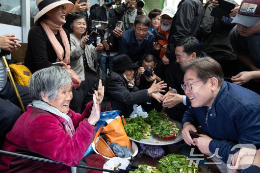 (인제=뉴스1) 이재명 기자 = '골목골목 경청투어 : 접경벨트편'에 나선 이재명 더불어민주당 대통령 후보가 2일 오후 강원 인제군 북면 원통시장에서 상인과 대화를 나누고 있다. 2025.5.2/뉴스1