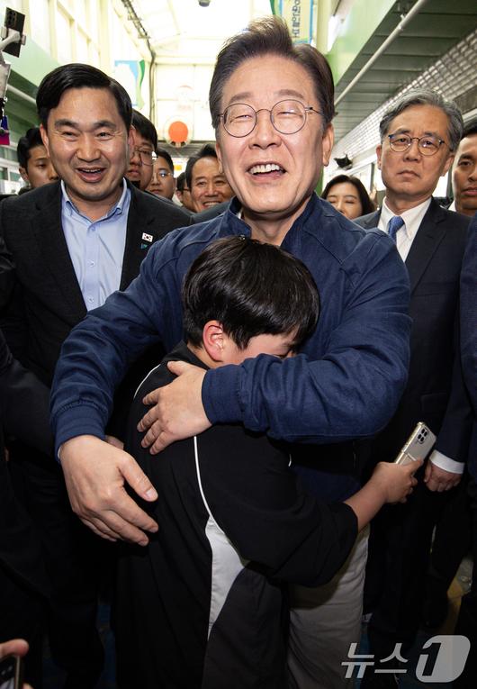 (인제=뉴스1) 이재명 기자 = '골목골목 경청투어 : 접경벨트편'에 나선 이재명 더불어민주당 대통령 후보가 2일 오후 강원 인제군 북면 원통시장에서 한 어린이를 안아주고 있다. 2025.5.2/뉴스1