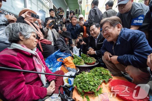 (인제=뉴스1) 이재명 기자 = '골목골목 경청투어 : 접경벨트편'에 나선 이재명 더불어민주당 대통령 후보가 2일 오후 강원 인제군 북면 원통시장에서 상인과 대화를 하고 있다. 2025.5.2/뉴스1