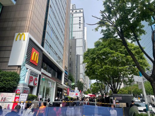 2일 오후 서울 강남구 19층 건물에서 투신 소동이 빚어지면서 인근 도로가 통제됐다. 독자 제공 |