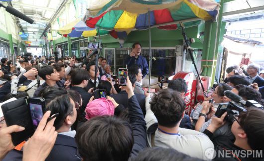 [인제=뉴스핌] 최지환 기자 = 이재명 더불어민주당 대선 후보가 '골목골목 경청투어' 접경지역 방문 이틀째인 2일 오후 강원 인제군 원통시장에서 주민들을 향해 연설하고 있다. 2025.05.02 choipix16@newspim.com