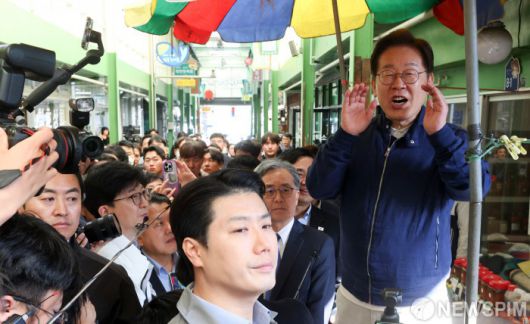 [인제=뉴스핌] 최지환 기자 = 이재명 더불어민주당 대선 후보가 '골목골목 경청투어' 접경지역 방문 이틀째인 2일 오후 강원 인제군 원통시장에서 주민들을 향해 연설하고 있다. 2025.05.02 choipix16@newspim.com