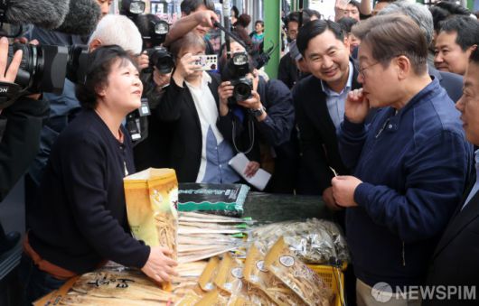 [인제=뉴스핌] 최지환 기자 = 이재명 더불어민주당 대선 후보가 '골목골목 경청투어' 접경지역 방문 이틀째인 2일 오후 강원 인제군 원통시장에서 황태포를 시식하고 있다. 2025.05.02 choipix16@newspim.com |