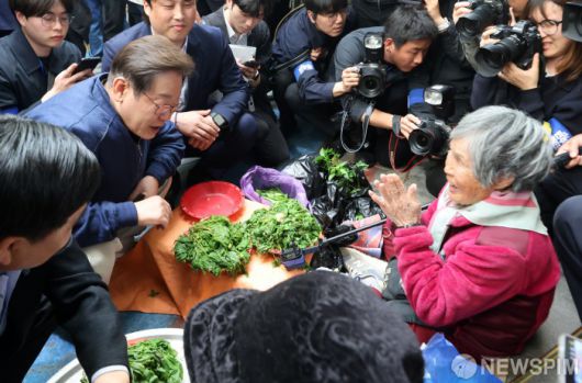 [인제=뉴스핌] 최지환 기자 = 이재명 더불어민주당 대선 후보가 '골목골목 경청투어' 접경지역 방문 이틀째인 2일 오후 강원 인제군 원통시장에서 한 상인과 대화하고 있다. 2025.05.02 choipix16@newspim.com |