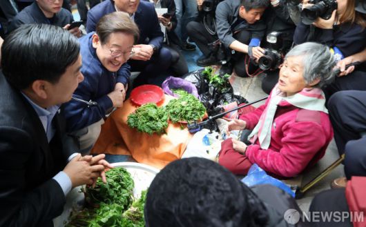 [인제=뉴스핌] 최지환 기자 = 이재명 더불어민주당 대선 후보가 '골목골목 경청투어' 접경지역 방문 이틀째인 2일 오후 강원 인제군 원통시장에서 한 상인과 대화하고 있다. 2025.05.02 choipix16@newspim.com