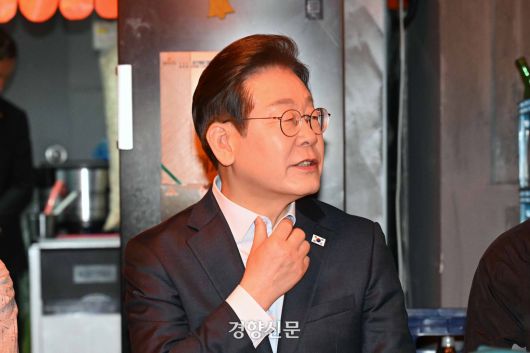 이재명 더불어민주당 대선 후보가 지난 1일 서울 종로구의 한 음식점에서 열린 비전형 노동자 간담회에 참석해 노동자들의 발언을 경청하고 있다. 대법원 전원합의체는 이날 이 후보에게 무죄를 선고한 원심판결을 파기하고 사건을 서울고법으로 돌려보냈다. 박민규 선임기자 |