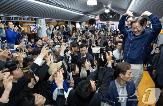 (고성=뉴스1) 이재명 기자 = '골목골목 경청투어 : 접경벨트편'에 나선 이재명 더불어민주당 대통령 후보가 2일 오후 강원 고성군 거진전통시장에서 시민들을 향해 인사하고 있다. 2025.5.2/뉴스1