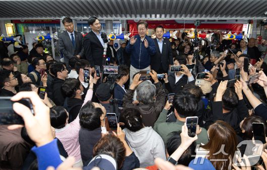 (고성=뉴스1) 이재명 기자 = '골목골목 경청투어 : 접경벨트편'에 나선 이재명 더불어민주당 대통령 후보가 2일 오후 강원 고성군 거진전통시장에서 시민들을 향해 발언을 하고 있다. 2025.5.2/뉴스1
