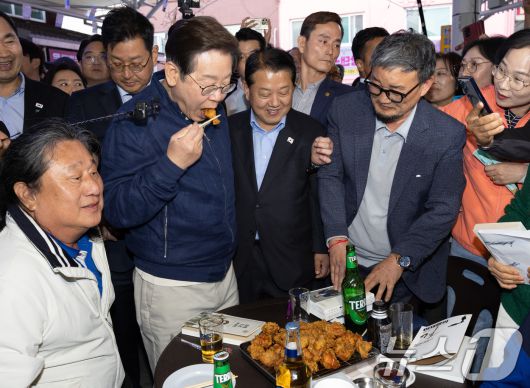 (고성=뉴스1) 이재명 기자 = '골목골목 경청투어 : 접경벨트편'에 나선 이재명 더불어민주당 대통령 후보가 2일 오후 강원 고성군 거진전통시장에서 치킨을 맛보고 있다. 2025.5.2/뉴스1