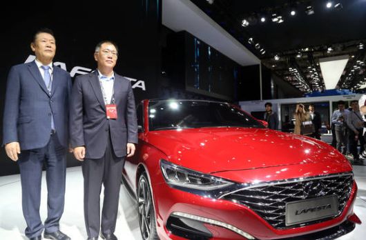 2018 베이징 국제 모터쇼에 참석한 정의선 당시 현대차그룹 부회장이 중국 전용 스포티 세단인 '라페스타(Lafesta)' 옆에서 기념촬영 하는 모습. 연합뉴스 |