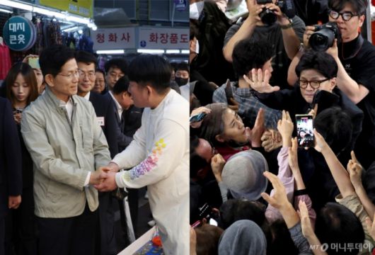 [대전·대구=뉴시스] 고승민·이무열 기자 = 국민의힘 대선 경선 김문수(가나다순, 왼쪽 사진), 한동훈 후보가 1일 각각 대전중앙시장과 대구 서문시장을 방문, 상인·시민과 인사를 나누고 있다. 2025.05.01. photo@newsis.com /사진=고승민 |