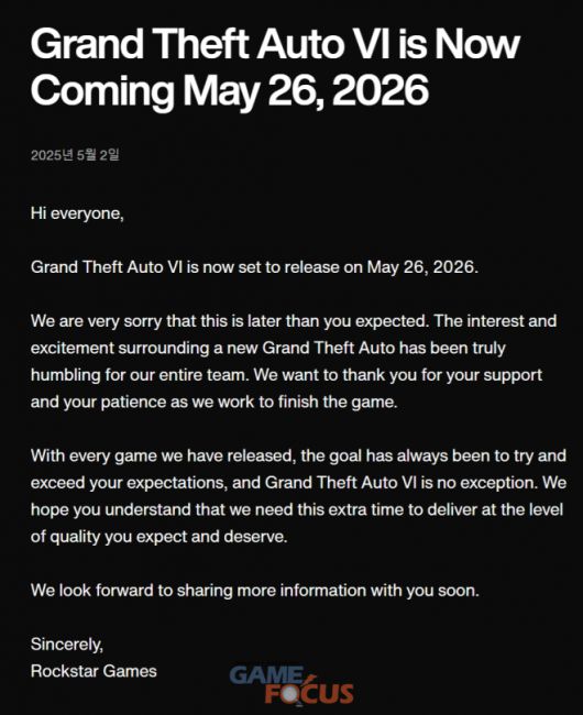 락스타게임즈는 “우리가 출시하는 모든 게임의 목표는 항상 유저들의 기대를 뛰어넘는 것이었고 GTA6 역시 예외는 아니다”며 “유저들이 기대하고 마땅히 받아야 할 수준의 퀄리티로 게임을 선보이기 위해 추가적인 시간이 필요함을 이해해주시길 바란다”라고 입장을 밝혔다.
